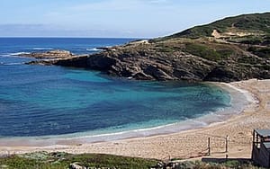 Der Strand (auch Cala Argentiera oder Cala Frana genannt) ist eine kleine Bucht mit dunklem Sand, ein gräulicher Halbmond, dessen Farbe vor allem auf Metallrückstände