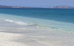 Seine Besonderheit ist der feine weiße Sand mit einer sehr langen Küstenlinie, die durch eine kleine felsige Klippe, herrliche Granitfelsen, in zwei Teile getrennt ist.